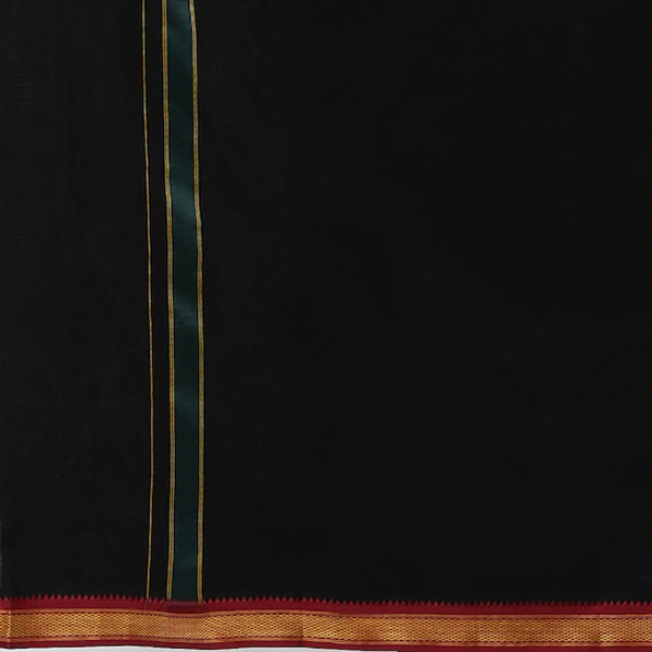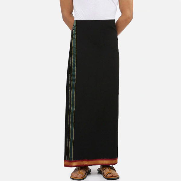 Black solid mid-rise dhoti, has a red and green sari border