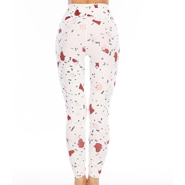 • White red and navy blue geometric print gym leggings, has inner broad elasticated wasitband, ankle length